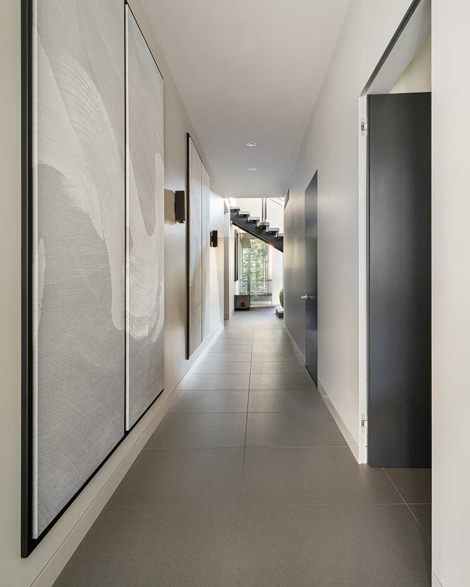 Beyond the great room, a sleek hallway leads to an office flooded with light and framed by views of Lookout Mountain, as well as a primary suite with a large fireplace and a spa-inspired bathroom. The far wing of the home offers access to the extensive garage, laundry room, and mudroom, along with two bedrooms featuring views of the nearby ski slopes. At the core of this 5-bedroom, 7.5-bathroom home’s ground level is another hallway with access to the rear patio. At the end of this hall, you’ll find a spacious gym/yoga/dance studio, and a golf simulator room.