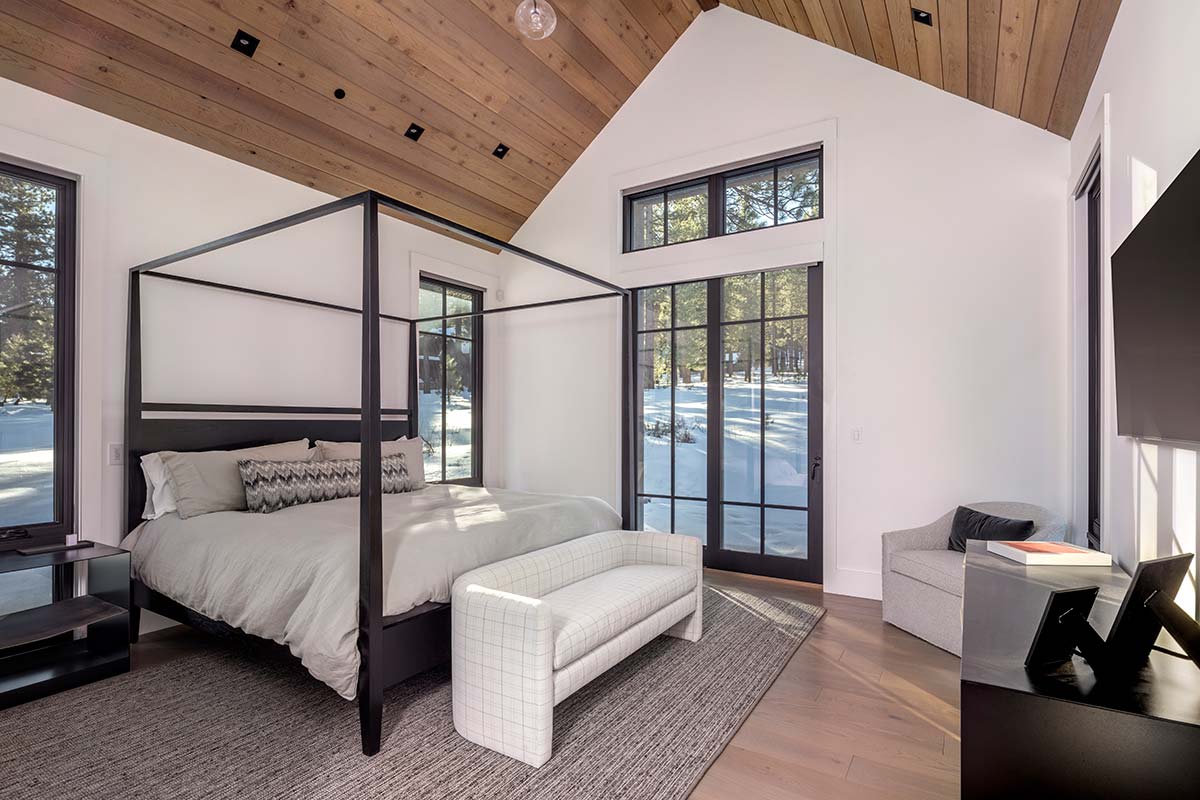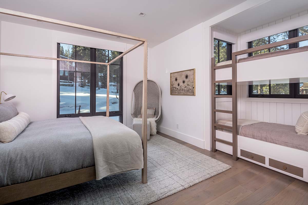 The elegance of this Mountain Modern Farmhouse is a product of one of the area’s leading architects and someone whose imprint is scattered throughout the community. The 3,674-square-foot Martis Camp home was designed by Clare Walton of Walton Engineering, the brilliance behind some of Martis Camp’s landmark amenities (including the Lookout Mountain Ski Lodge) and many of the community’s iconic homes, including this 4 bedroom, 5 bathroom estate. Complementing Walton’s architectural prowess is a serene, welcoming design scheme of neutral palettes infused with cool tones created by the award-winning interior design firm Sullivan Design Studio. Like the Lookout Mountain Ski Lodge, this home makes the most of natural light, as one senses straight away. Before you is a living space that glows, literally and figuratively. The great room features tall windows, a fireplace, black iron beams traversing the peaked ceiling, and the immediacy of a back patio with hot tub, firepit, barbecue bay, and heated/covered dining. And sun. An abundance of warming wintertime sun. It generates a positive vibe that runs the length of the home, including the dining room and the kitchen, both adjacent to the great room. The bold, broad and beautiful counter in the kitchen welcomes weary-eyed coffee seekers as well as friends and family in search of evening gatherings. Beyond the kitchen is a primary suite with access to the patio on one side and, on the north side, a deep bath perched beside a window with faraway views. The other wing of the home features a media room with big screen tv and a door opening to the back patio. There’s also a bedroom nearby with king bed and bunk beds. A stairway climbs to a landing with couch – the ideal place to crack open a new book. To one side of this landing is a sunny bedroom with loft while the other side leads you to a bedroom with queen bed, bunks and additional loft.