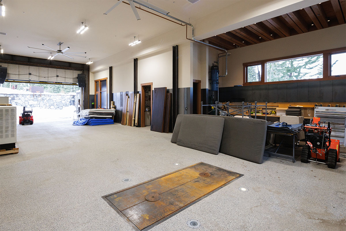 Beneath the 2,054 sq. ft. guest house lies a spectacular 1,800 sq. ft. garage space—accessible by stairs, an elevator, or even a climbing wall—featuring soaring ceilings, scissor-lift doors, and dual access points. This exceptional garage can accommodate 9+ vehicles, as well as a full array of Tahoe recreational vehicles, from boats and off-road vehicles to bikes and snowmobiles, catering to both car enthusiasts and outdoor adventurers alike.
